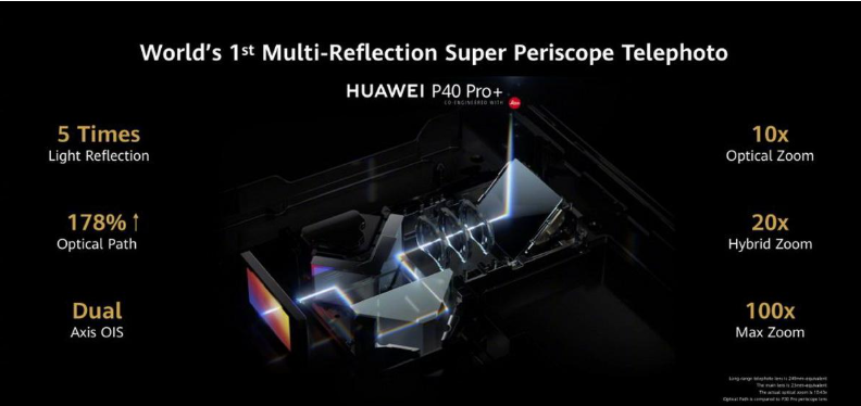 Huawei проблему решила. Чтобы сократить количество линз и уменьшить габариты модуля в перископическом модуле применили систему из пяти отражающих поверхностей. А для компенсации тряски внедрили двойную систему стабилизации. В итоге Huawei P40 Pro+ предложил пользователям не только 10-кратный оптический, но и 20-кратный гибридный зум, а максимальное цифровое приближение достигло отметки 100x.